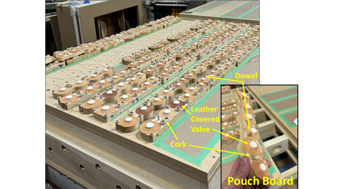 The picture above shows the top board of the lower Choir wind chest. This large wind chest will hold 16 ranks of pipes (976 pipes) and is very complex! Holes route wind from the frame to the pouch board. T-nuts are embedded in the glue joint for a machine screw to hold the pouch boards. A close up of a pouch board is shown in the lower right inset picture. There are 120 of these in this chest alone. Each valve has 5 different pockets machined from two sides and is covered with round, thin pieces of tan and white leather. Cork is glued to the top of the screw holes and a dowel is used to line up placement on the top board. This wind chest will be installed next week in the lower center louvered Choir division enclosure.